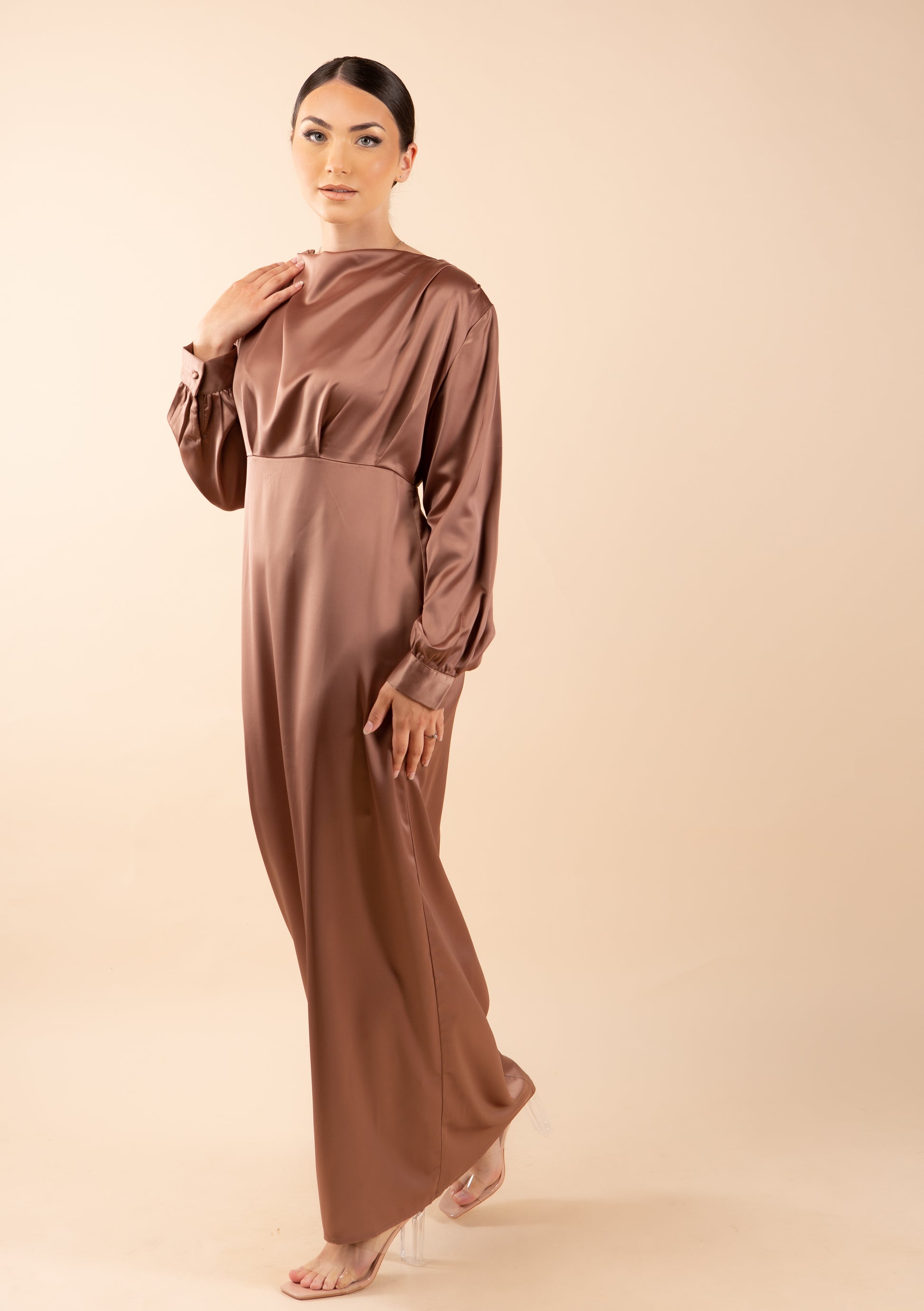 Emerald is luxurious, fancy and unique. The emerald dress comes in two color night black and gold caramel. With high waist, button semi buff sleeves and oval neckline. The emerald dress is floor length it is the perfect dress for special occasions, wedding and parties.