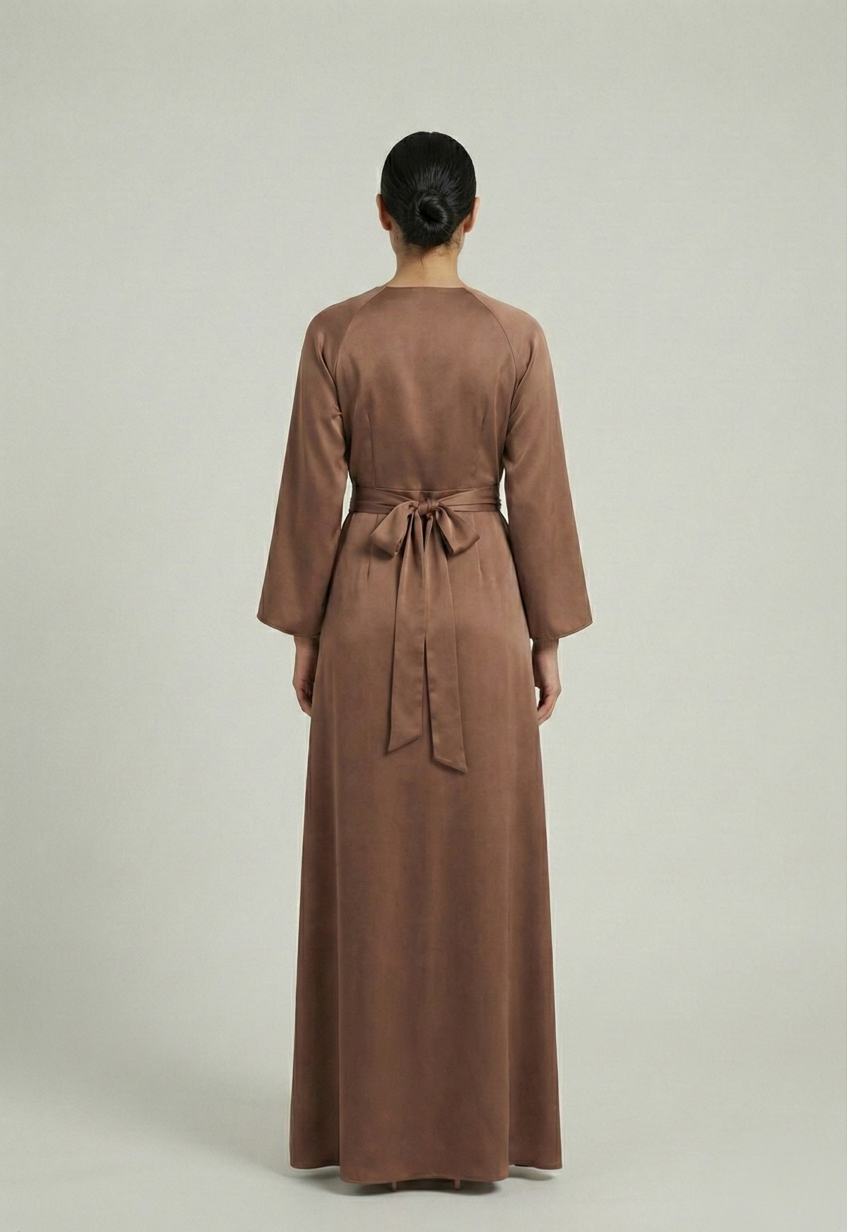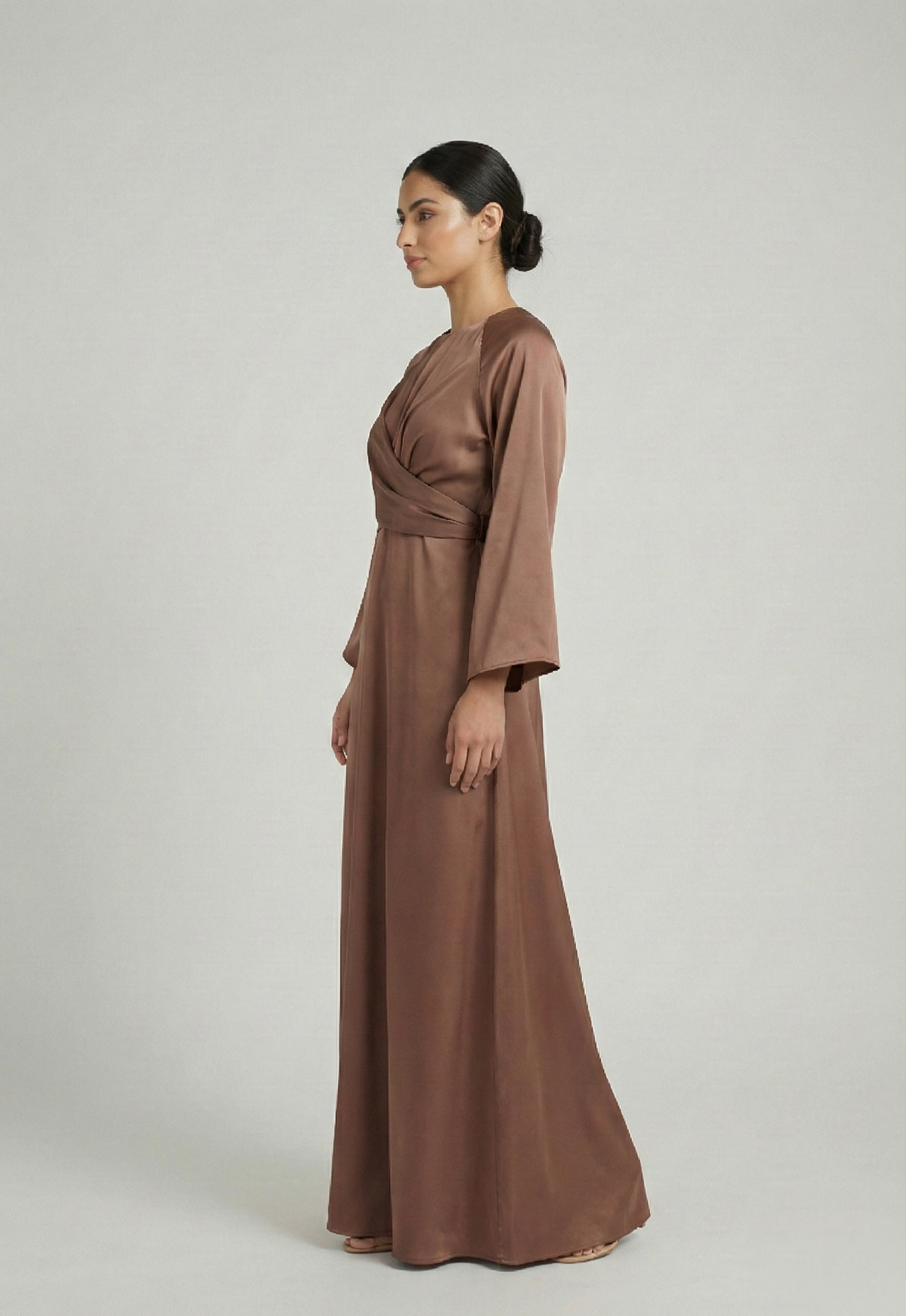 Crafted from smooth, fluid satin, this dress features a wrap-style bodice with soft pleated detailing that defines the waist while allowing natural movement. The long, wide sleeves and flowing skirt create a balanced silhouette that feels both graceful and comfortable.
