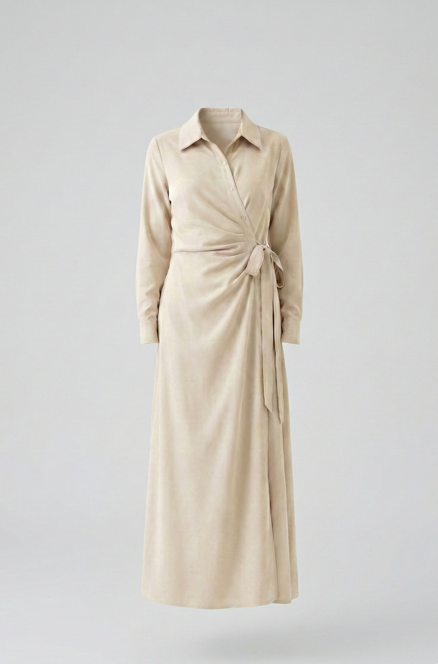 Crafted from a smooth, fluid fabric, this dress features a clean collared neckline, long sleeves, and a softly draped wrap detail that ties at the waist. The silhouette flows naturally, offering both comfort and refinement while maintaining a modest fit.